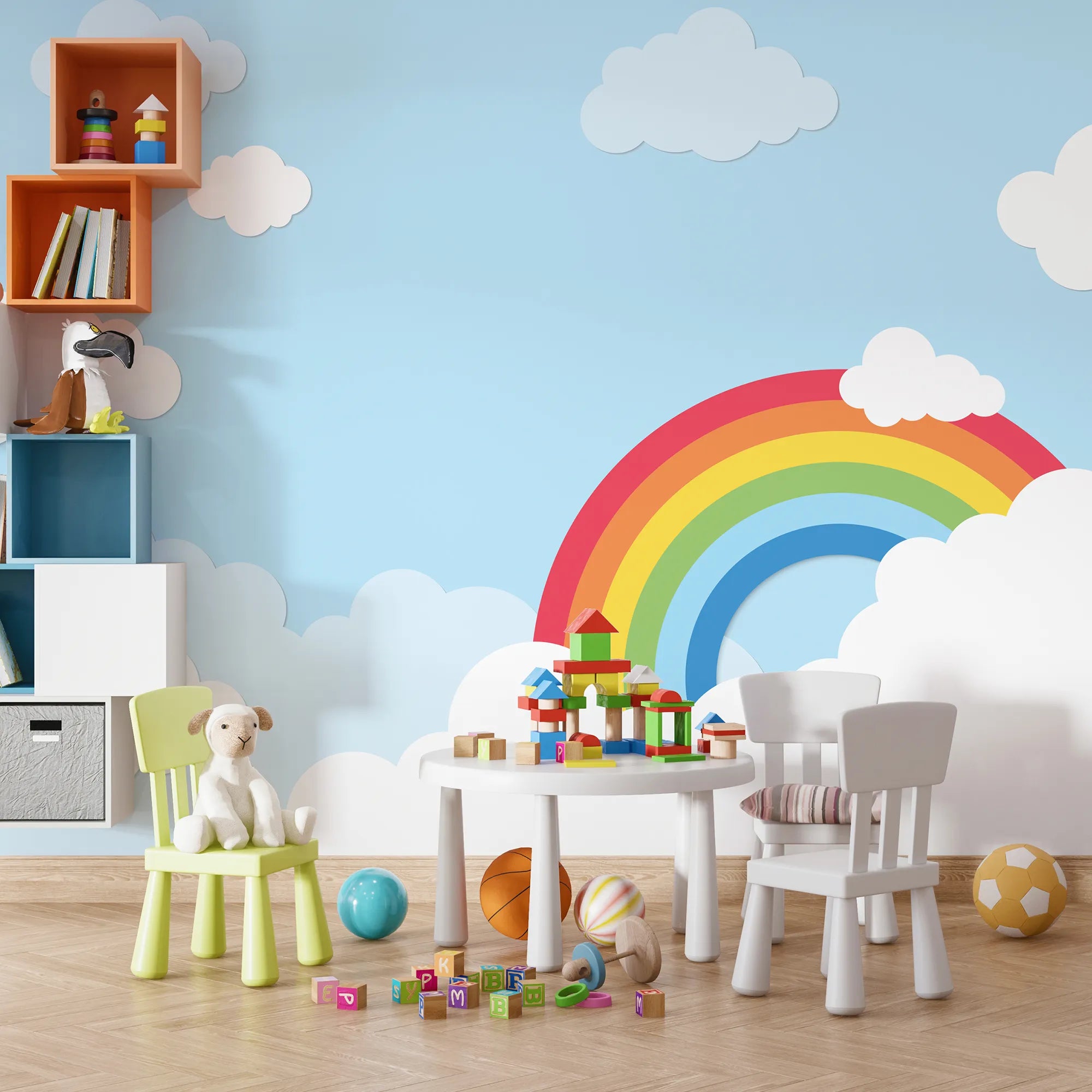 Unleash Creativity with Our Fun Wallpaper: Give your child's space a unique touch with our mural wallpaper. The dreamy sky, fluffy clouds, and vibrant rainbow will spark joy and creativity in your child. Ideal for a nursery, kid's bedroom, or playroom, this fun wallpaper is a beautiful addition that will stimulate your child's imagination and turn their room into a space they love.