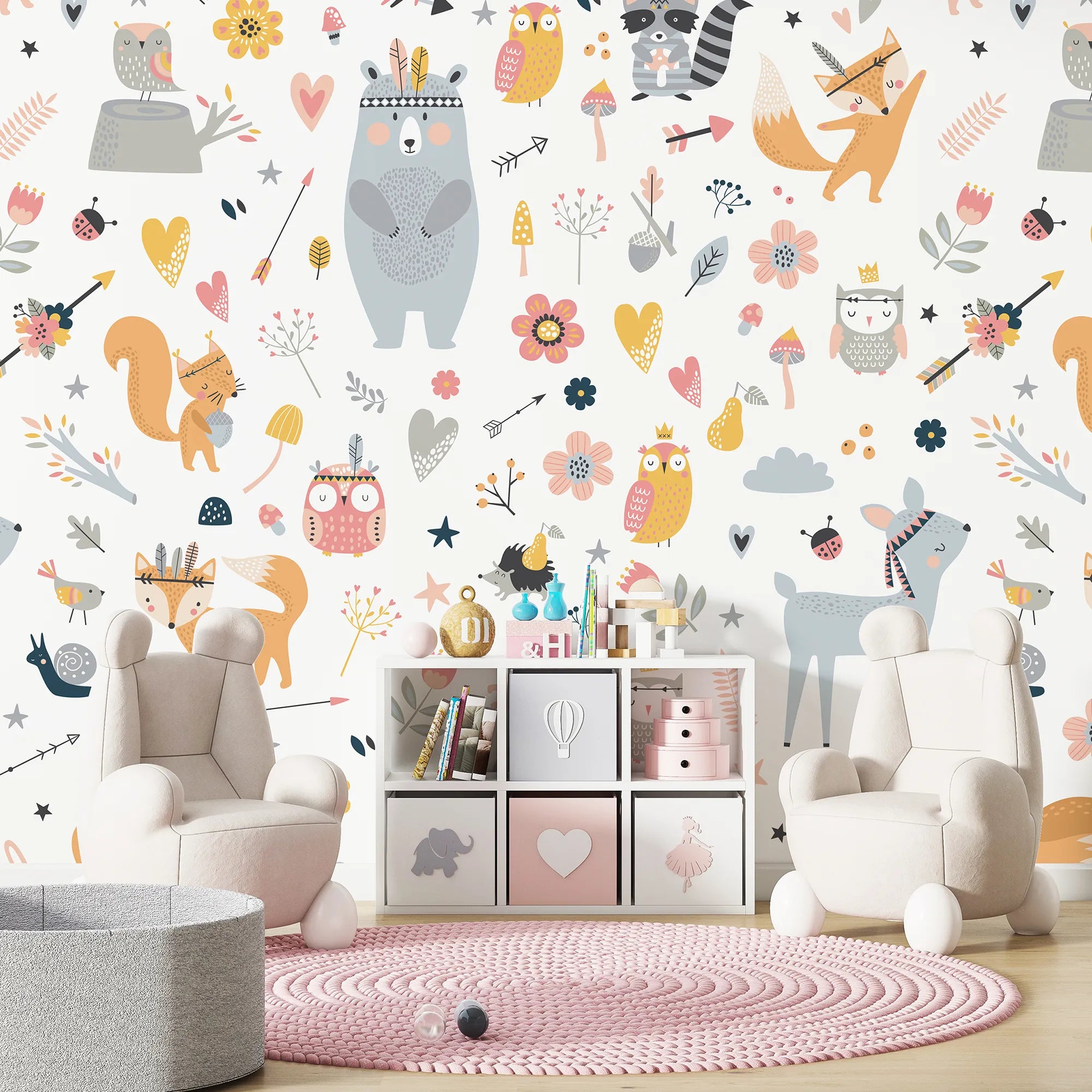 Add Fun to the Room with Kid's Wallpaper: Create a charming and whimsical atmosphere with our fun wallpaper. The cute foxes amidst the white forest animals will stimulate your child's imagination, making it a delightful addition to a boho kids room decor or baby nursery.